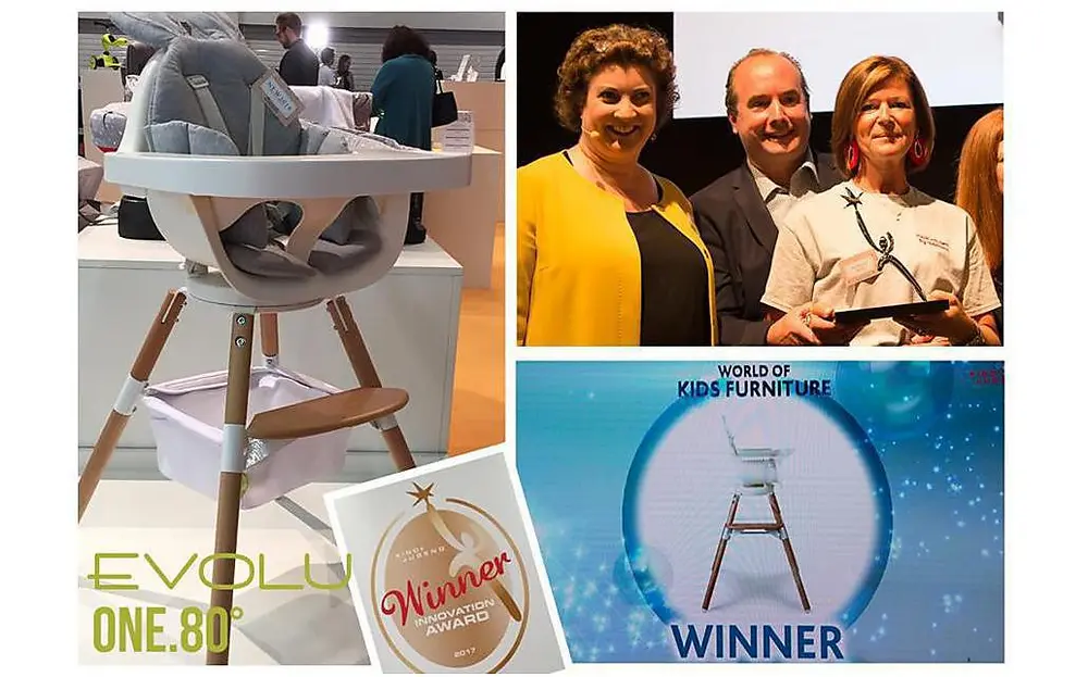 Nadat de Evolu eetstoel al in 2013 in de prijzen viel op Kind + Jugend, mocht dit jaar ook zijn opvolger een Innovation Award ontvangen. De Evolu One 80° heeft een nieuwe feature gekregen, waardoor hij voor ouders nog veelzijdiger is. De nieuwe eetstoel is nu uitgerust met een mechanisme waardoor de bovenkant simpelweg naar links of naar rechts kan draaien. Nathalie Aerts: "We hadden niet verwacht dat we de prijs zouden winnen, omdat het eigenlijk een eenvoudig idee is." "Het is begonnen toen we ons kleinkind, nu 9,5 maand, op bezoek hadden. We willen haar eten geven en toen stelden we ons de vraag of we het zitje niet draaibaar konden maken, zonder daarvoor de hele stoel te verplaatsen", vertelt Stefan Aerts verder. Nathalie: "We zijn zeer tevreden met deze award. Hiermee bewijzen we dat Childhome steeds innoverend en vernieuwend wil zijn en dan we onze producten steeds willen verbeteren."