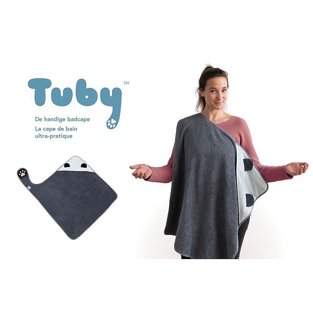 De Tuby™ badcape heeft een verzwaard pootje die je over je schouder gooit voordat je gaat badderen met je baby. Door de verzwaarde voetkussentjes van het pootje blijft de Tuby™ badcape slim voor je hangen.Je wordt nu zelf niet nat en je hebt beide handen vrij om je baby na het badderen uit het badje te pakken en meteen warm in te wikkelen.De Tuby™ badcape is superzacht en gemaakt van biologische katoen. Hij is er als vrolijke aap, als speelse panda en als pluizige koala. Maak kennis met Tuby™ op Kind+Jugend, hal 11.3 stand D041 (Invented 4 Kids) en op de Kids World Days, showroom Aquarelle 370: Malin-Agency, Patricia Van Loon: 0479/50.03.21, info@malin-agency.be