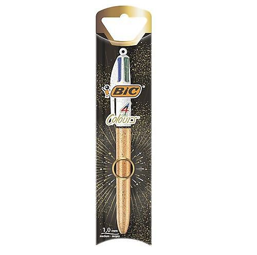 Vier het 50-jarig jubileum van BIC® 4 Colors® met een sprankelende editie in het thema 'Frozen'. De balpennen hebben een gouden en getextureerde body voor een nieuwe look. De punt van 1,0 mm geeft een medium lijnbreedte van 0,32 mm.